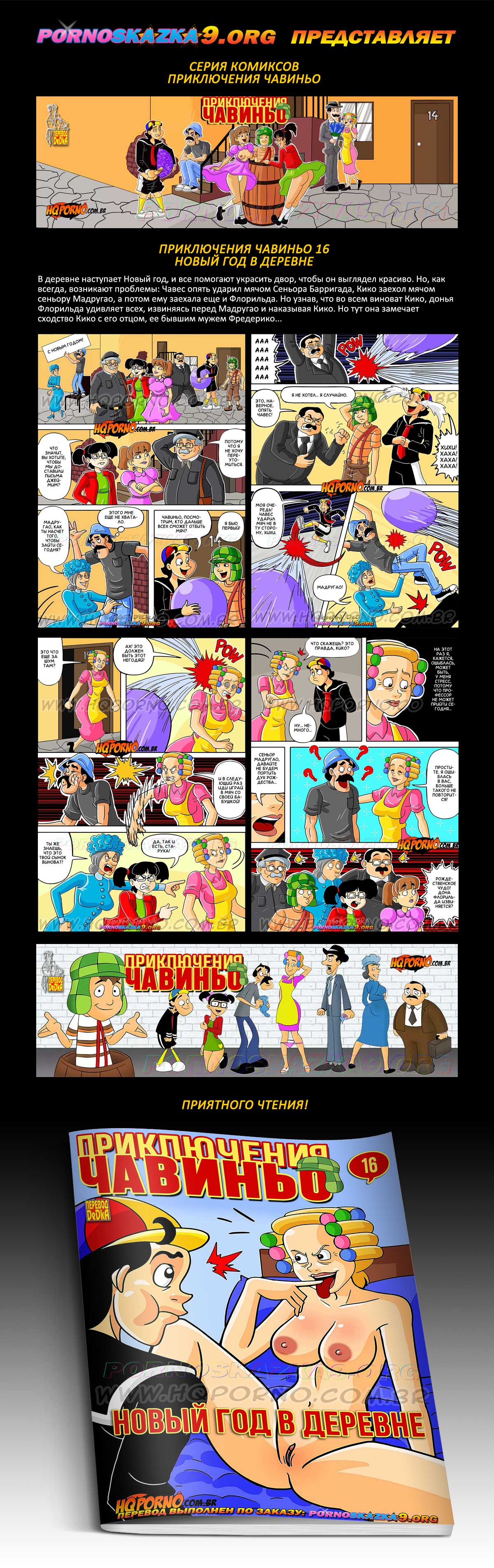 Порно комикс «Приключения Чавиньо. Часть 16. Новый год в деревне.» В деревне наступает Новый год, и все помогают украсить двор, чтобы он выглядел красиво. Но, как всегда, возникают проблемы: Чавес опять ударил мячом Сеньора Барригада, Кико заехал мячом сеньору Мадругао, а потом ему заехала еще и Флорильда. Но узнав, что во всем виноват Кико, донья Флорильда удивляет всех, извиняясь перед Мадругао и наказывая Кико. Но тут она замечает сходство Кико с его отцом, ее бывшим мужем Фредерико…